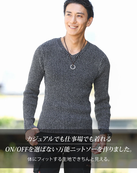 二重臼リブ編みストレッチVネックニット