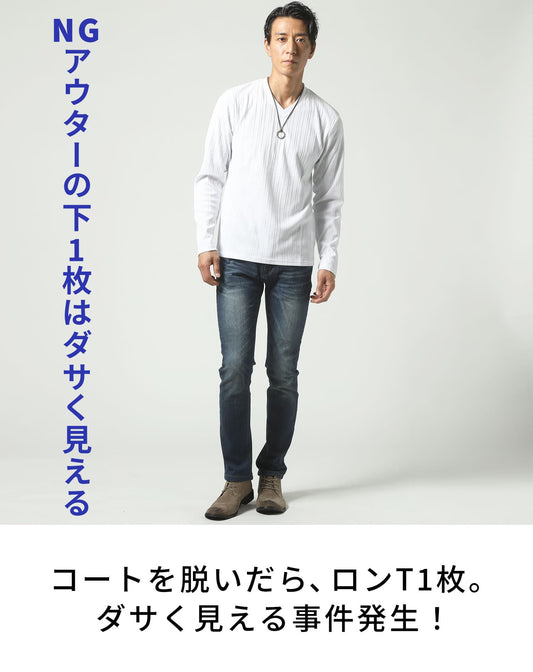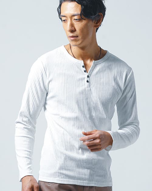 ランダムテレコ素材スリムフィット長袖ヘンリーネックTシャツ