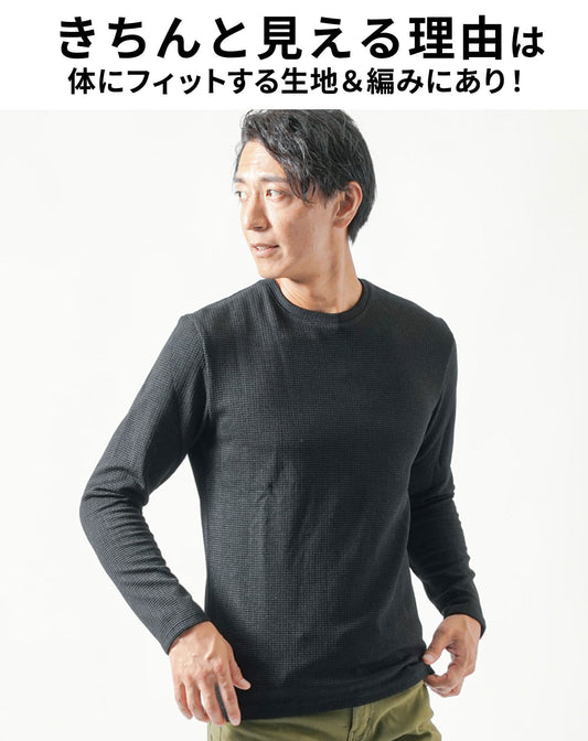 ワッフル編みクルーネック長袖ニットTシャツ